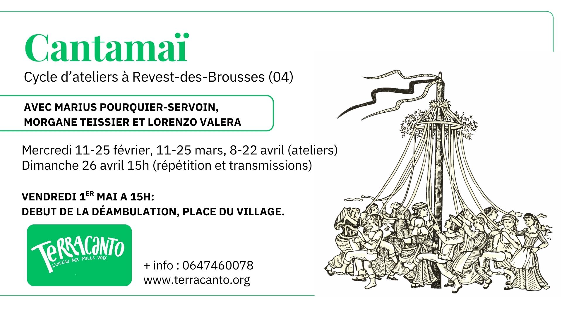 A partir du mercredi 11 février débutent des ateliers de chants pour préparer les célébrations du mois de mai. Partage d’un répertoire de chants en français, italien et occitan, autour du mois de mai, du printemps, des oiseaux et de la nature ; chants d’amour, chants à danser et chants de lutte. Un répertoire à chanter lors de la déambulation du Cantamaï le vendredi 1er mai après-midi à Revest-des-Brousses.
