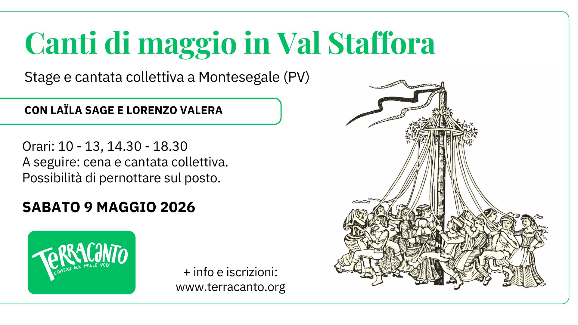 Il laboratorio é dedicato ai repertori tradizionali di un’area che va dal nord-ovest dell’Italia al sud-est della Francia: regioni dove da sempre il mese di maggio è celebrato con canti, processioni, mascherate e rituali che segnano il risveglio della natura e il rafforzamento dei legami comunitari. Territori attraversati da una profonda continuità culturale nelle forme musicali, nei gesti rituali, nella visione simbolica del mondo.